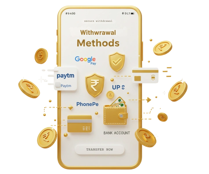 You can withdraw money through Paytm, UPI, Google Pay, PhonePe, or direct bank transfer securely.